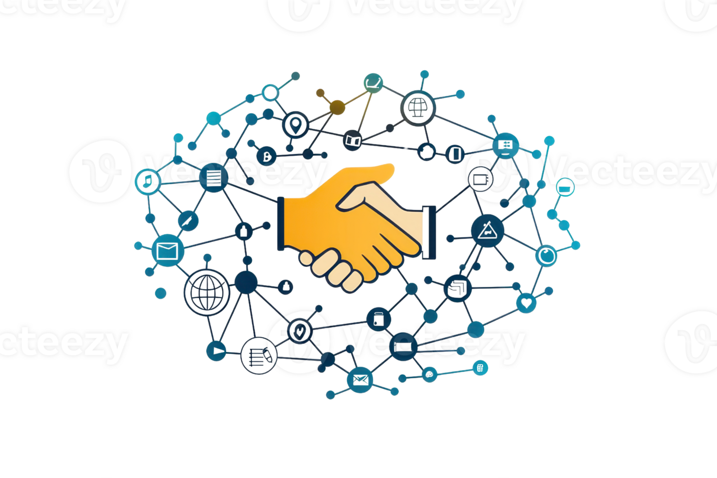digitale Rete concetto in mostra globale tecnologia connessioni e collaborazione con un' stretta di mano nel un' in rete digitale sfondo. PNG Pro