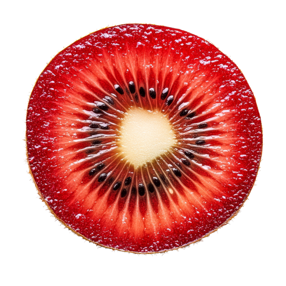 un' vivace fetta di rosso Kiwi in mostra suo unico colore e struttura contro un' pulito trasparente sfondo, fetta di rosso Kiwi su trasparente sfondo png
