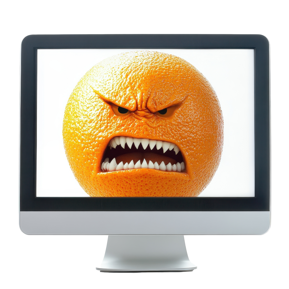 computer schermo viene visualizzato un arrabbiato arancia con acuto denti e un' feroce espressione, computer schermo con un arrabbiato arancia su esso, trasparente sfondo png