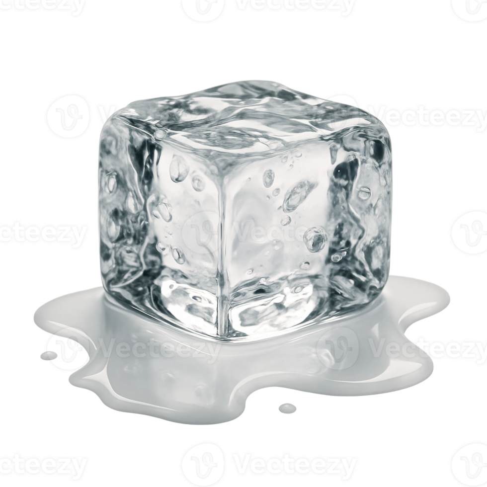 un' trasparente ghiaccio cubo è mostrato nel il processi di fusione, con un' visibile pozzanghera di acqua diffusione su a suo base. PNG Pro