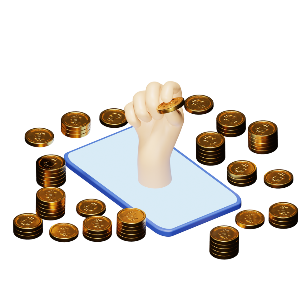Rendering 3d di uno sfondo bianco, tecnologia blockchain di criptovaluta bitcoin, con le mani fuori dalle monete mobili png