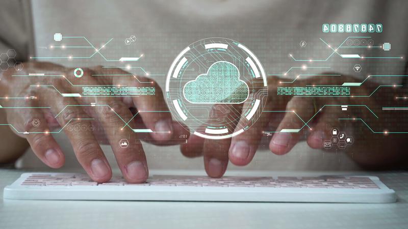 un uomo che utilizza un computer per la connessione a un ologramma di dati di cloud computing. sfondo digitale aziendale. Video Gratuito