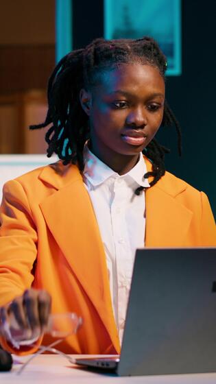 verticale video ritratto di dedito allievo studiando classe materiale e Appunti per aumentare conoscenza, Lavorando a partire dal casa su sua progetti. alunno ricercando per Compiti utilizzando ragnatela biblioteche. telecamera un. Video Pro