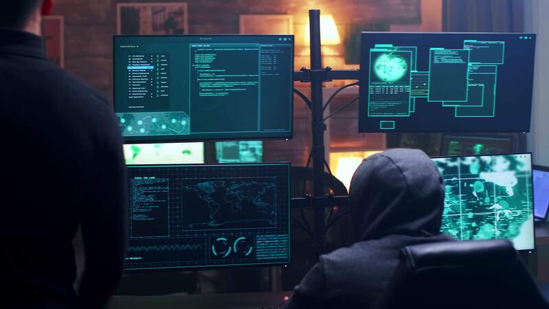 indietro Visualizza di incappucciato informatica terrorista utilizzando super computer nel buio camera. squadra di hacker. Video Pro