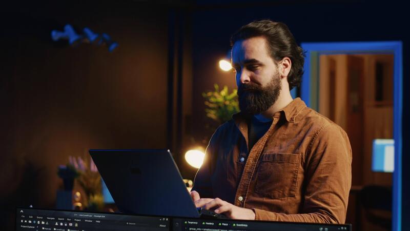 ritratto di sorridente uomo fare esso supporto lavoro a partire dal casa, in piedi nel personale ufficio con il computer portatile nel mano, codifica. allegro programmatore scrittura Linee di codice su taccuino nel vivente camera, telecamera un' Video Pro