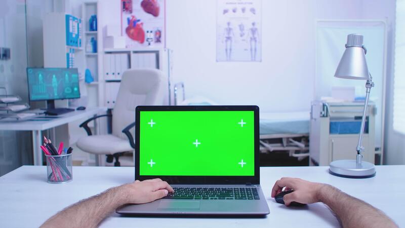 pov di assistente utilizzando il computer portatile con copia spazio a disposizione nel ospedale Consiglio dei ministri e medico Lavorando su computer. medico utilizzando taccuino con croma chiave su Schermo nel medico clinica. Video Pro