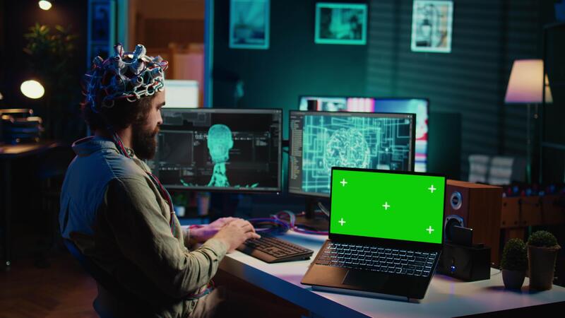 esso Admin codifica e utilizzando eeg cuffia per caricare cervello in verde schermo computer portatile, guadagnando immortalità. neuroscienziato ingegneria transumanesimo sperimentare su croma chiave dispositivo, telecamera B Video Pro