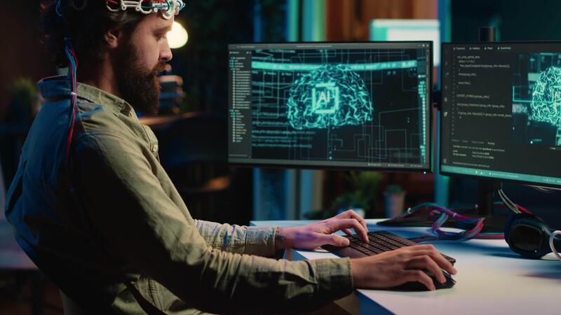 esso Admin codifica e utilizzando eeg cuffia per caricare cervello in computer, guadagnando immortalità. neuroscienziato ingegneria transumanesimo sperimentare, inserzione coscienza in cyberspazio, telecamera un' Video Pro