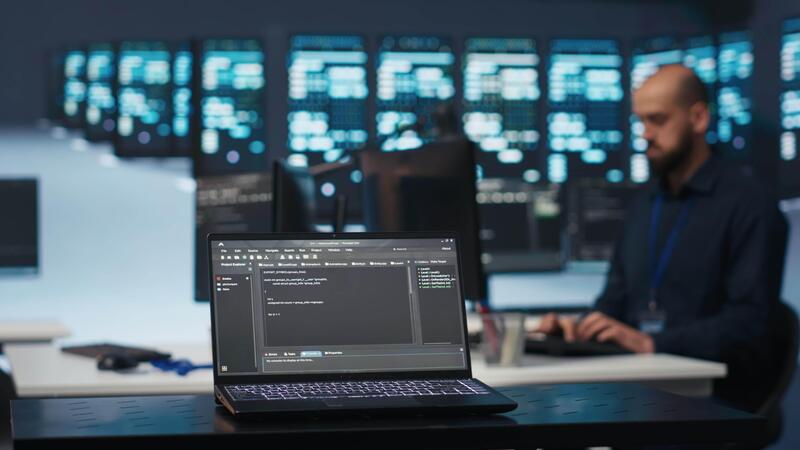 messa a fuoco su il computer portatile Usato di programmatore in esecuzione codice nel sfocato sfondo per dati centro server, risoluzione dei problemi impianti di perforazione. vicino su tiro di codice Linee su taccuino schermo nel server centro Video Pro