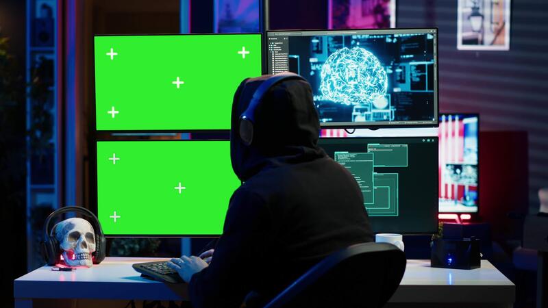 pirata ascoltando musica mentre utilizzando isolato schermo pc e ai per rubare dati. truffatore indossare cuffie utilizzando artificiale intelligenza e modello computer per compromesso digitale dispositivi, telecamera un' Video Pro