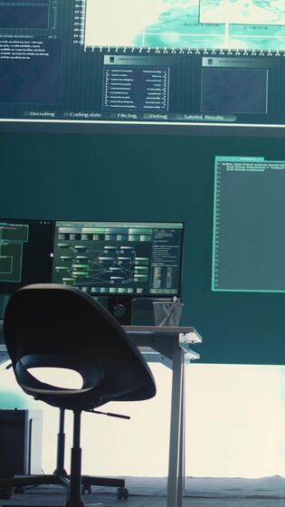 verticale vuoto governativo informatica sicurezza camera con computer e Software visualizza. enfasi su Rete sicurezza, informatica difesa, e intelligenza raccolta per impedire informatica attacchi e spionaggio. telecamera b. Video Pro