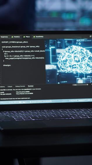 verticale il computer portatile nel dati centro istituzione con artificiale intelligenza calcolo simulando umano cervello. vicino su tiro di taccuino visualizzazione ai macchina apprendimento algoritmi, telecamera un' Video Pro