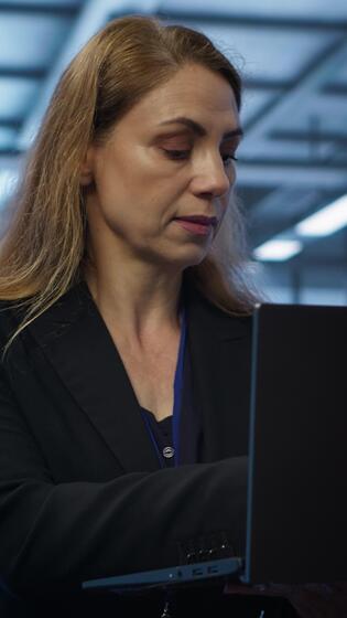 verticale ingegnere fare annuale verifica per prolungare dati centro elettronica vita span e evitare tempi di inattività. donna nel server camera monitoraggio server infrastruttura componenti utilizzando computer portatile, telecamera un' Video Pro