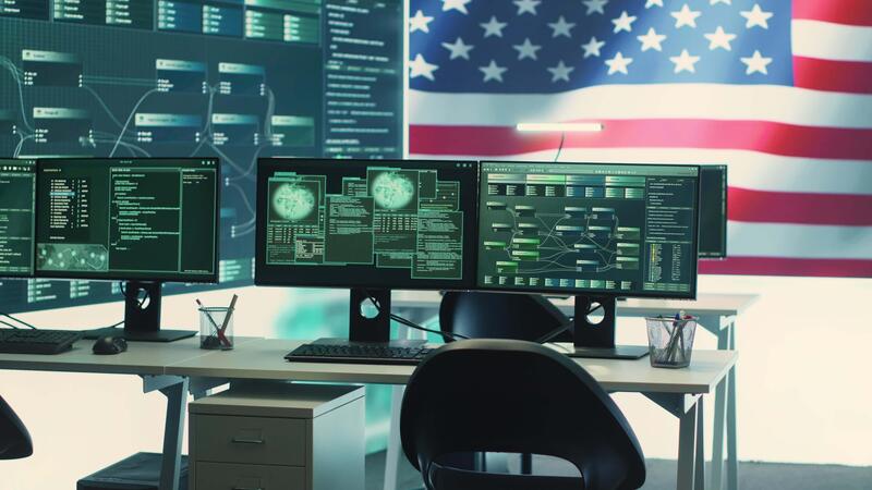 vuoto informatica ambiente con il americano bandiera su un' grande schermo. sottolineando informatica operazioni, digitale sicurezza e Avanzate tecnologia per informazione sicurezza e informatica difesa. telecamera un. Video Pro