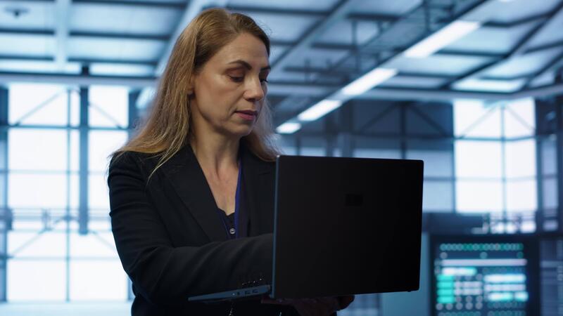ingegnere fare annuale verifica per prolungare dati centro elettronica vita span e evitare tempi di inattività. donna nel server camera monitoraggio server infrastruttura componenti utilizzando computer portatile, telecamera un' Video Pro