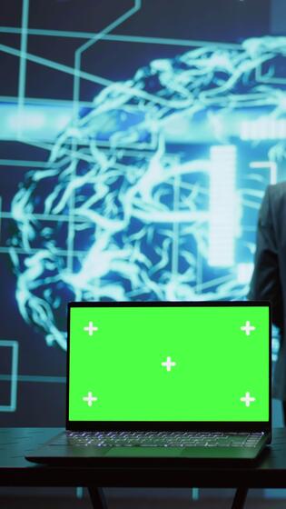 verticale lavoro di gruppo ai tecnici utilizzando verde schermo il computer portatile per attività commerciale dati analisi. squadra di esso esperti lavori su modello taccuino per automatizzare compiti utilizzando artificiale intelligenza, telecamera B Video Pro