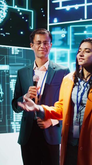 verticale presentatore e specialista ospite parlando a ai vertice portando insieme Tech startup professionisti, esplorando ultimo sviluppi nel artificiale intelligenza e in profondità apprendimento tecnologia, telecamera B Video Pro