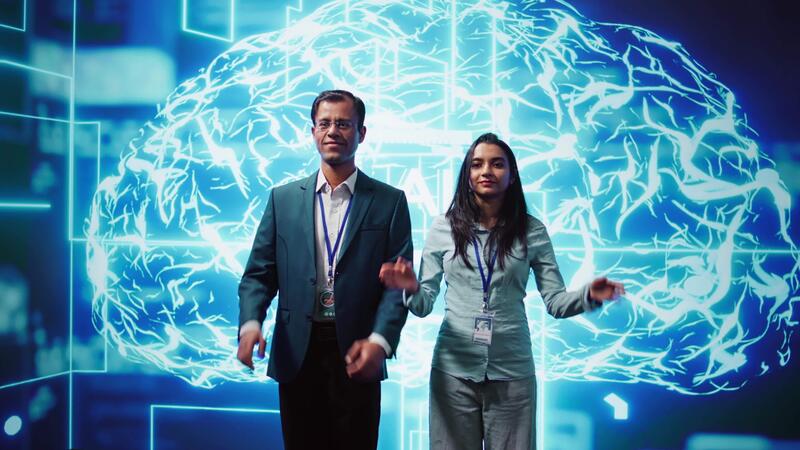 ritratto di allegro squadra di amministratori utilizzando artificiale intelligenza calcolo simulando umano cervello. sorridente colleghi Lavorando con ai macchina apprendimento algoritmi, telecamera B Video Pro