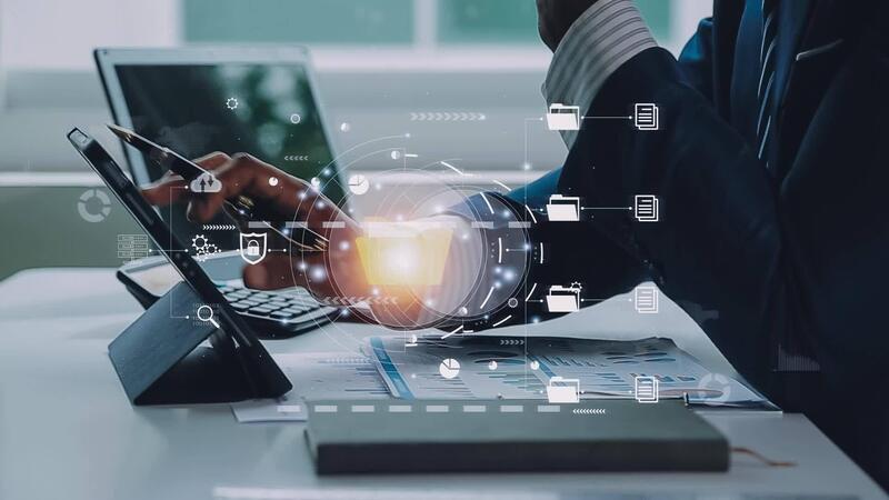 concetto di gestione dei documenti. icone dello schermo virtuale sistema di gestione dei documenti dms database di documenti online, software per l'archiviazione, la ricerca e la gestione efficiente di file e dati aziendali. Video Gratuito