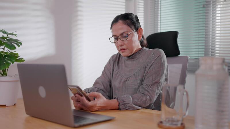 sorridente giovane donna, contento imprenditore utilizzando il computer portatile e mobile tecnologia, controllo e-mail, visualizzazione sito web, Lavorando remoto in linea o apprendimento a partire dal casa, seduta a tavolo a casa. Video Gratuito