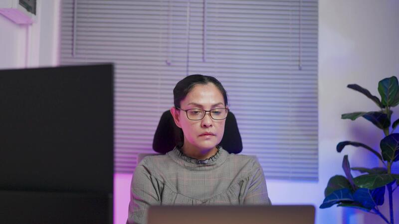 donna indossare bicchieri guardare a grande digitale problema tecnico schermo mentre visualizzazione Linee di codice. professionale gli hacker rompere in informatica sicurezza difese. Video Gratuito