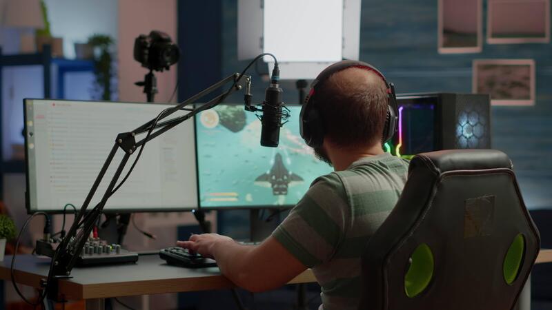 professionale stella filante vincente spazio tiratore video gioco a vivere concorrenza giocando a partire dal casa studio. in linea streaming informatica l'esecuzione durante gioco torneo utilizzando potente computer con rgb luci Video Pro
