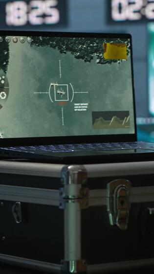 verticale aria vigore ufficiale l'esecuzione tattico livello sorveglianza nel comando camera utilizzando il computer portatile. vicino su di militare specialista nel base di operazioni utilizzando radar su taccuino per Guarda a assalto zone, telecamera un' Video Pro