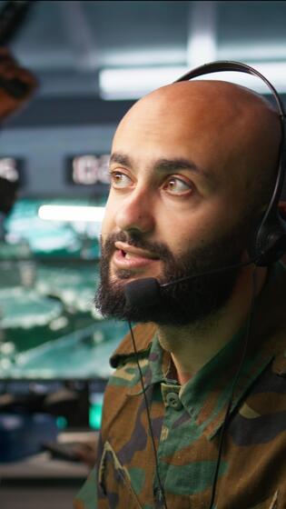 verticale mezzo orientale militare dispatcher relè Informazioni a partire dal esercito intelligenza analisti per truppe su davanti linee, vicino su. Radio comunicazioni operatore discutere con collega utilizzando cuffia microfono, telecamera B Video Pro