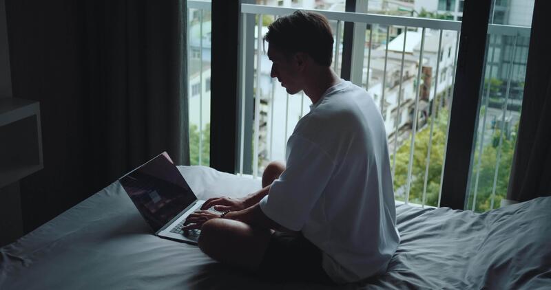 a distanza Software sviluppatore, Lavorando diligentemente su il suo il computer portatile mentre comodamente seduto su casa letto, lavorazione intricato Linee di programmazione codice. indietro Visualizza maschio programmatore telelavoro a partire dal il suo Camera da letto Video Pro