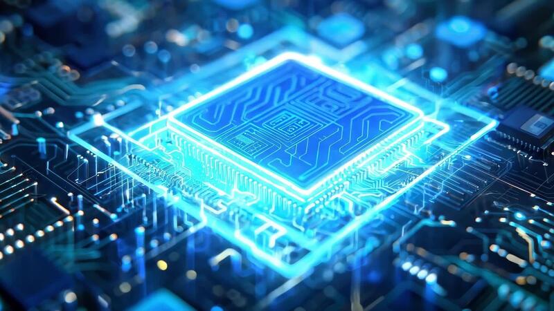 avvicinamento Visualizza di un' raggiante microchip su un' blu circuito asse, in mostra Avanzate tecnologia e intricato design. Video Gratuito