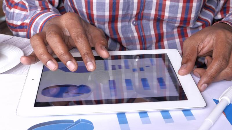 un' uomo è utilizzando un' tavoletta computer con grafici su esso Video Pro