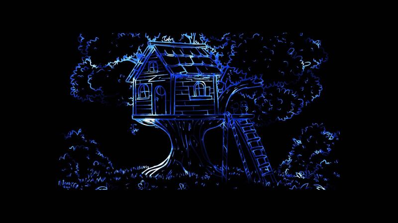 neon telaio effetto, casa sull'albero annidato alto nel un' albero con un' corda scala e un' piccolo su nero sfondo Video Gratuito