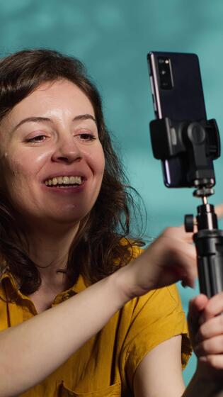 verticale sorridente donna nel studio utilizzando smartphone su autoscatto bastone per disco , saluto iscritti. gioioso intrattenitore padroni di casa q e un' sessione con spettatori utilizzando cellulare, salutando fan, telecamera un' Video Pro