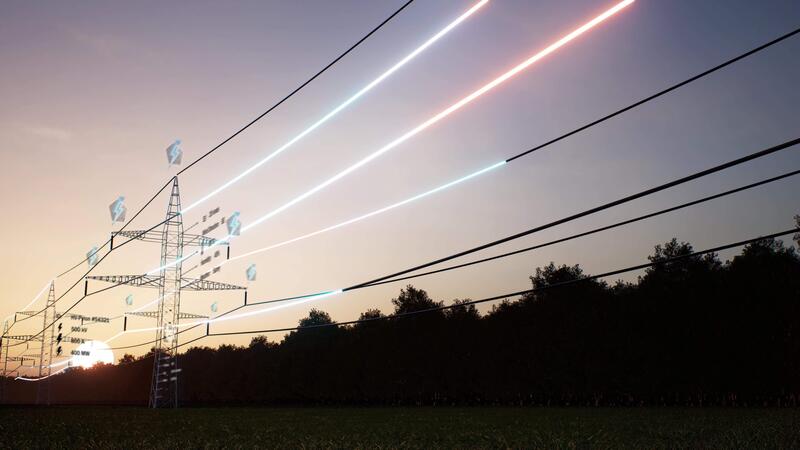 visualizzazione di energia ruscello in viaggio attraverso alto elettrico trasferimento Linee al di sopra di tramonto orizzonte cielo. ar dati di sostenibile elettricità fluente dentro ragnatela di interconnesso cavi, 3d rendere Video Pro