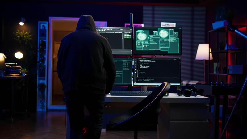 pirata in arrivo nel segreto base con computer portatile, pronto per inizio programmazione virus. truffatore nel penale tana apertura taccuino per sfruttare Rete server e circonvallazione sicurezza le misure, telecamera B Video Pro
