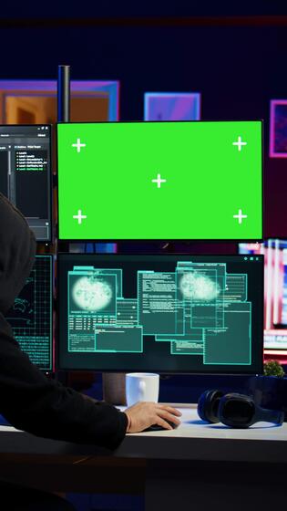 verticale canaglia programmatore utilizzando verde schermo pc per mod firewall, ottenere attacchi respinto di sicurezza informatica. truffatore utilizzando modello tenere sotto controllo vedendo accesso negato errore Messaggio mentre impegnarsi frode, telecamera B Video Pro