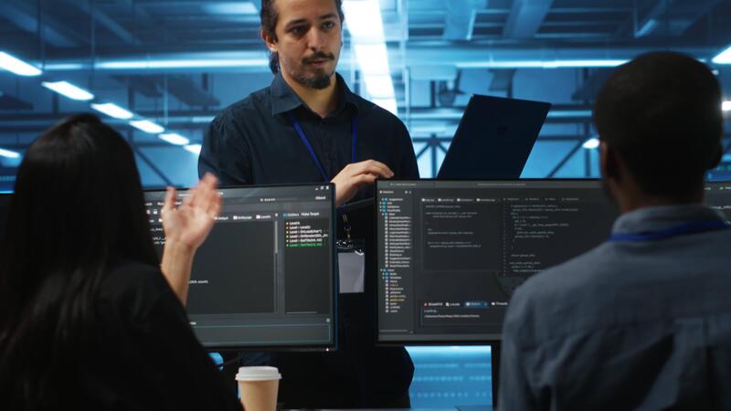 manager e esso supporto specialisti Lavorando insieme, supervisione server righe nel computer Rete sicurezza dati centro. supervisore e multietnico dipendenti supervisione supercomputer Video Pro