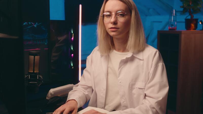 femmina programmatore programmatore caucasico donna investitore notte in ritardo computer opera a casa sorridente contento ragazza signora donna d'affari attività commerciale azione mercato commerciante crypto moneta bitcoin grafici ragnatela commercio in linea Video Pro