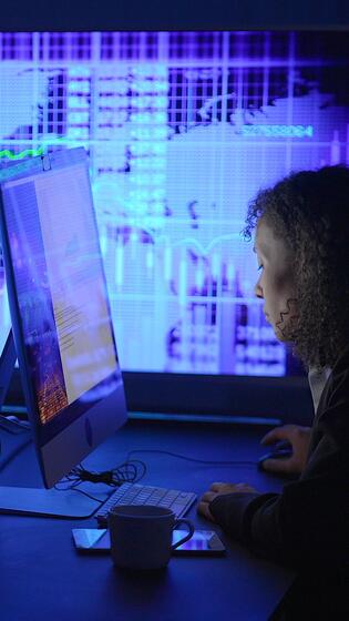 un individuale con messa a fuoco e concentrazione analizzando dati su un' computer schermo appare impegnato Video Pro