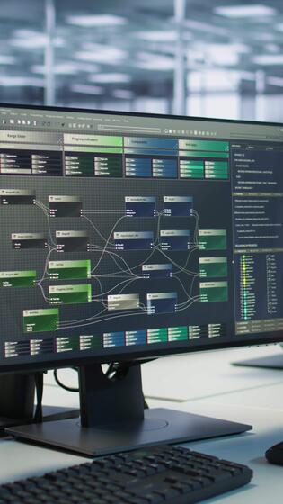 verticale vicino su di computer viene visualizzato nel vuoto dati centro istituzione monitoraggio hardware energia consumo. pc schermi su server centro ufficio scrivania mostrando programmazione Software Video Pro