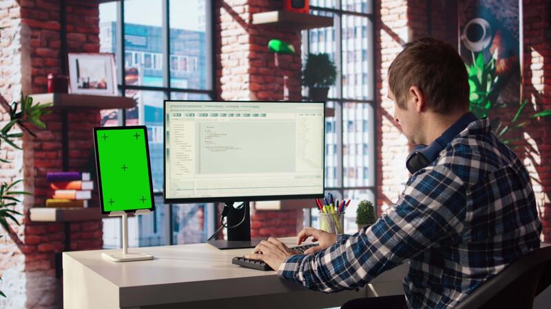 programmatore a scrivania digitando codice in computer, sviluppando Software programmi, consulenza verde schermo tavoletta. uomo nel casa ufficio fissaggio errori nel applicazione utilizzando croma chiave dispositivo e pc, telecamera un' Video Pro
