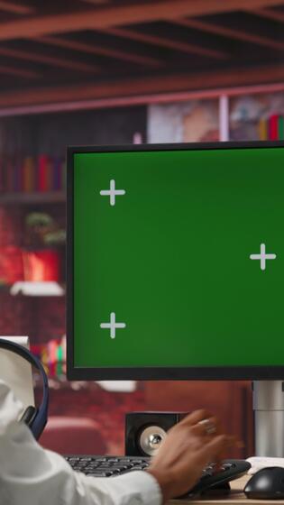 verticale donna godendo tempo libero tempo a casa, utilizzando verde schermo computer per testo gli amici. persona parlando con compagni su sociale Rete in linea sito web, utilizzando modello pc tenere sotto controllo, telecamera B Video Pro