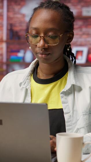 verticale telelavoratore potabile caffè mentre utilizzando taccuino a casa per Scrivi e-mail. a distanza dipendente godendo caldo bevanda e utilizzando computer portatile, comporre documenti per consegnare finalizzato progetto scartoffie, telecamera B Video Pro