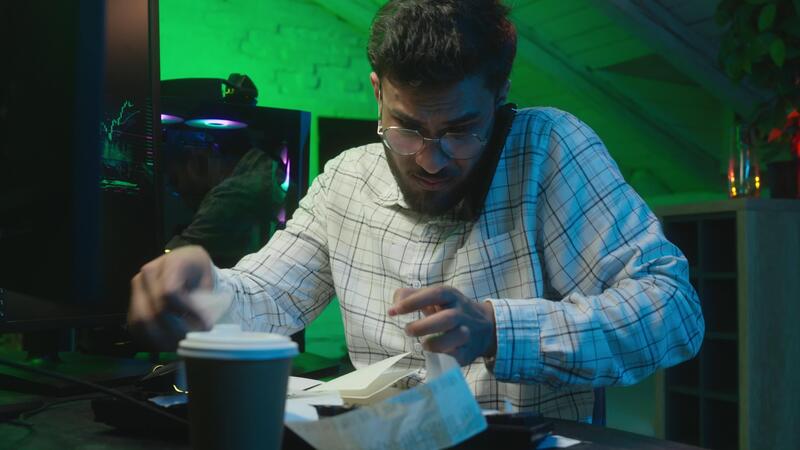 indiano arabo uomo parlando mobile Telefono libero professionista tipo maschio problema perso sbaglio stressato preoccupato ansia programmatore codice pirata computer cyberspazio criptovaluta dai un'occhiata fatture guaio programmatore smartphone Video Pro