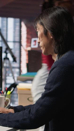 verticale Software ingegnere nel piccolo attività commerciale spazio di lavoro utilizzando computer per sorvegliare artificiale intelligenza neurale reti. persona nel Tech avviare ufficio utilizzando ai macchina apprendimento sistemi su pc, telecamera un' Video Pro