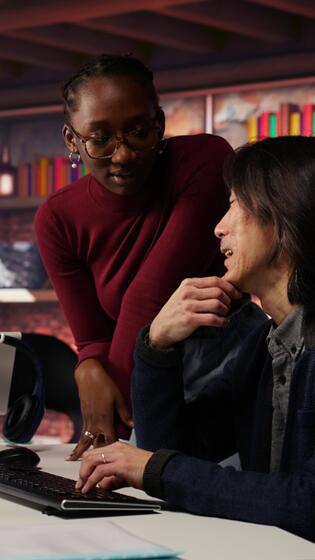verticale programmatore In arrivo per ai avviare ufficio cto manager scrivania per richiesta aiuto. dipendente chiede domande per anziano squadra capo nel artificiale intelligenza Software sviluppo agenzia, telecamera B Video Pro
