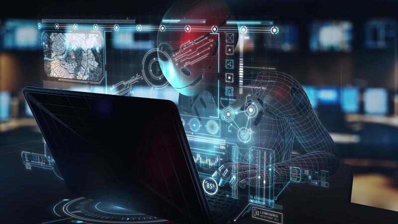 robot utilizzando il computer portatile con futuristico hud interfaccia e dati analisi visualizzazione Video Pro