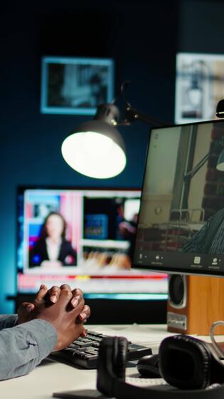 verticale africano americano uomo gode conferenza con manager a scrivania, discutere con il suo collega in linea utilizzando un' computer a casa ufficio impostare. giovane associati squadra incontro in linea. telecamera un. Video Pro