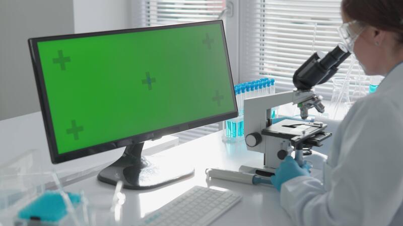 nel un' laboratorio, un' ricercatore nel un' bianca cappotto esamina un' campione sotto un' microscopio, mentre un' nelle vicinanze computer viene visualizzato un' luminosa verde schermo, mostrando un importante, in corso studia nel Tech e scienza Video Pro