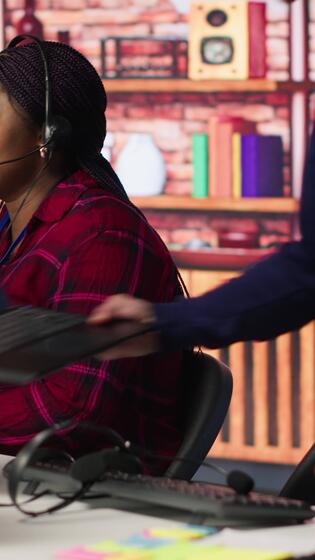 verticale chiamata centro anziano ingegnere in arrivo a opera, utilizzando ai, porzione i clienti riguadagnare accesso per conti. cliente centro tecnico a scrivania utilizzando artificiale intelligenza, assistere clienti, telecamera un' Video Pro